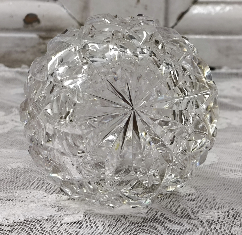 OverzichtOude klassieke parfum fles van dik glas met slijpsel. Onderop zit een ingeslepen ster. Zeer mooi stopje binnenin, origineel. Glas is nog mooi helder. Keuren zijn te vinden op de deksel, Engelse keuren.