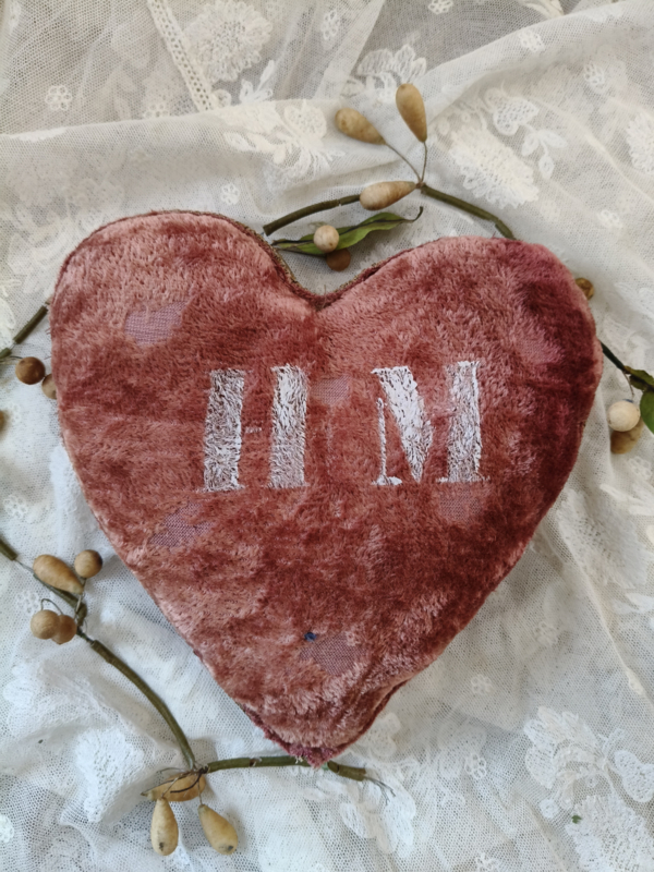 Oud bruidskussentje met de letters H en M. Afgewerkt aan de zijkant met een gouden band randje. Heeft boven en onderop wat sleetse plekjes te zien op de foto.