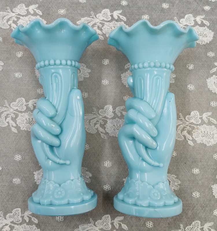 Set oude opaline vaasjesSet oude opaline vaasjes. Handjes houden een zgn hoorn des overvloeds vast. Eerste foto komt nog het beste overeen qua kleur. Ze zijn gaaf. 1 Heeft een productie foutje aan het voetje, niks schokkends zie foto..