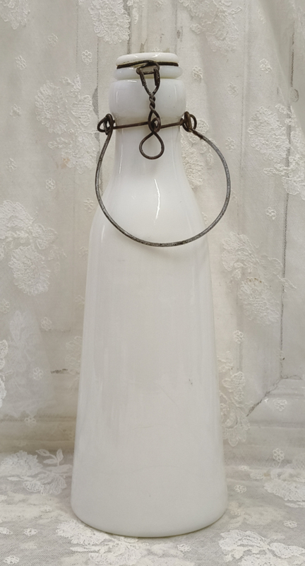Oude Franse melkflesOude Franse melkfles van melkglas. Gaaf. Heeft twee donkere plekjes in het glas waarvan èèn achterop en stipjes rechts van het midden voorzijde.